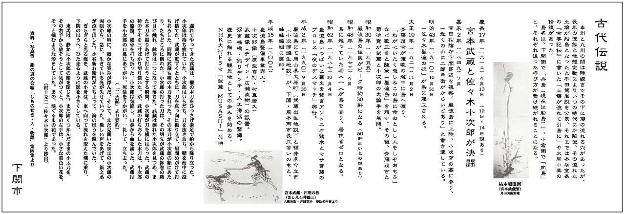 2003年2月12日の設置の様子です。 早朝(満潮時)に、乙女丸に乗り、巌流島へ。接岸してユンボで吊り上げて本体上陸。ダンプに積み、丘の傍まで付けます。それからは、8人で抱えて丘を登ります。そして、基礎にアンカーセットして朝日が射しはじめたころ完了。 この日まだ丘には小次郎像のみ。 『武蔵・・・』